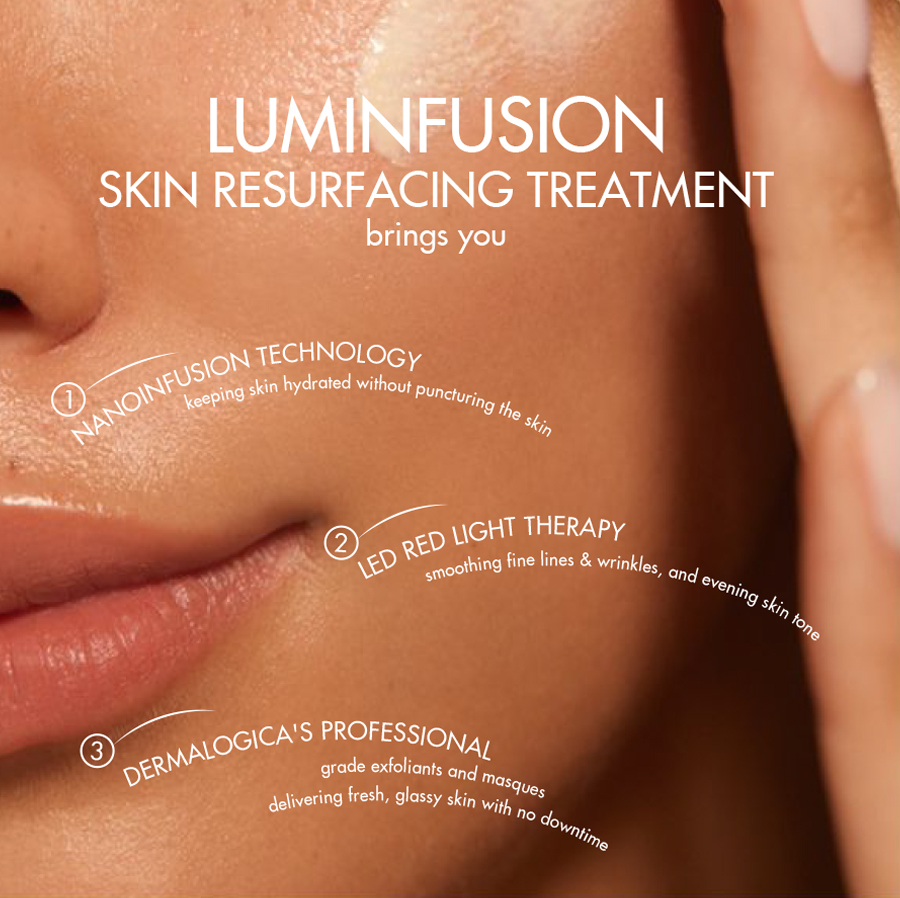 Luminfusion is our latest facial treatment, a 90-minute, non-invasive facial designed to rejuvenate and resurface the skin deeply. Powered by Dermalogica’s research, Luminfusion combines the Nano Infusion Technique, Red Light Therapy, and professional-grade exfoliation & masque to deliver a luminous, youthful complexion with no downtime.